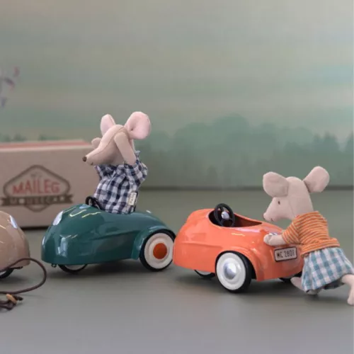Elke muis van Maileg, van kleine broer tot papa muis, past in de auto.