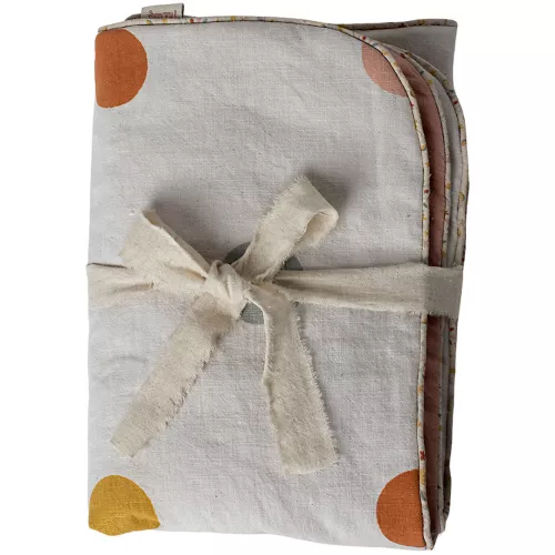 De kinderdeken van linnen ramie heeft aan de ene zijde een lieflijk stippenpatroon. De andere kant is effen roze.