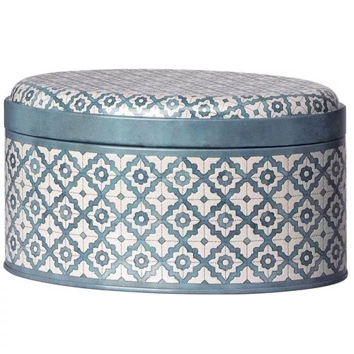 Deze nostalgische opbergtrommel lijkt zó van grootmoeder’s tafel te komen. De ovalen blikken opbergdoos ‘Sweet Delight’ van het Deense merk Maileg heeft een grijsblauw geometrisch patroon met bloemetjes.