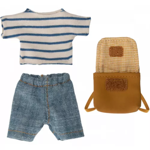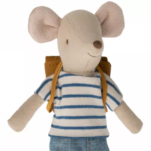 Knuffelmuis ‘Tricycle mouse – Big brother with bag’ van het Deense merk Maileg fietst graag rond. Met zijn gestreepte t-shirt, spijkerbroek en rugzakje is hij gekleed om een dagje naar school te gaan.
