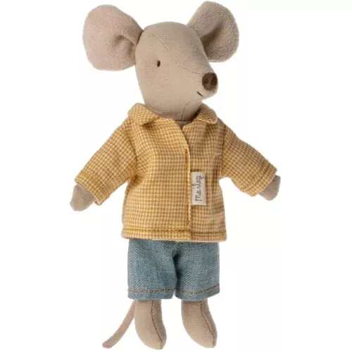 De geruite jas van deze muizenknuffel is behalve een mooie jas ook een behaaglijke pyjama. Onder zijn jas draagt de knuffel een broek van denimstof. De poppenkleertjes kunnen uitgetrokken worden.