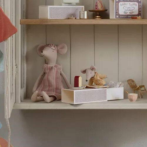 Knuffelmuis ‘Big Brother Mouse’ van het Deense merk Maileg heeft zijn eigen luciferdoosje om in te slapen. Compleet met een kussen, matras en beddengoed, want dat is wel zo fijn.