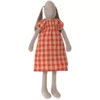 Het gestreepte jurkje van deze speelgoedmuis is zowel een mooi zomerjurkje als ook een nachtjapon. De poppenkleertjes kunnen uitgetrokken worden.
