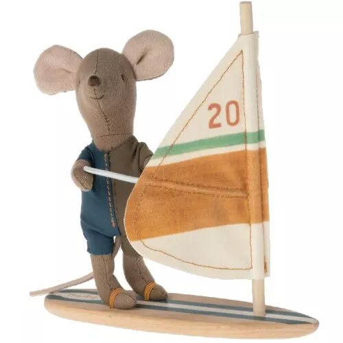 Knuffelmuis ‘Beach Mice – Surfer Little Brother’ van het Deense merk Maileg is goed voorbereid op een dagje op het water. Gekleed in een wetsuit bedwingt hij met zijn windsurfboard iedere golf.