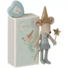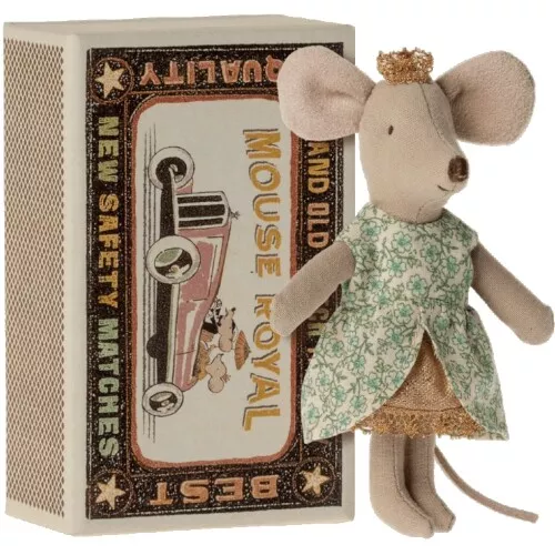 Het knuffeltje heeft geborduurde oogjes en neusje. De muizenknuffel draagt een gouden kroontje en een gouden glitterjurk met gebloemde overgooier. In haar luciferdoosje slaapt ze op een gebloemd kussen en een gebreide deken.