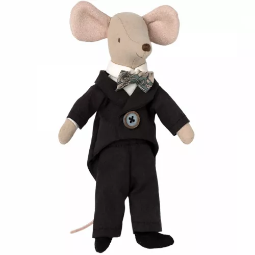 Het muizenstel is klaar om te trouwen en hebben zich uitgedost. Meneer muis draagt een zwart colbertje, een zwarte broek en een vrolijke strik. Mevrouw muis draagt een witte trouwjurk, sluier en een boeket.