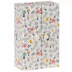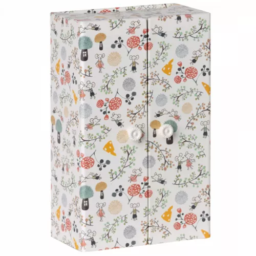 De knuffelmuisjes zitten verpakt in een decoratieve opbergdoos met openslaande deuren.