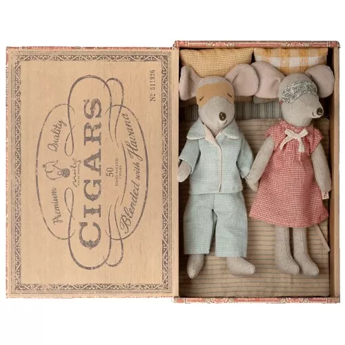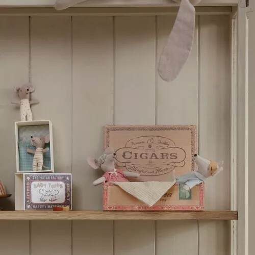 Twee kleine knuffelmuizen ‘Mum & Dad Mice’ in een speels sigarendoosje van het Deense merk Maileg. De vertederende muisjes passen in zakjes of tasjes en gaan makkelijk overal mee naar toe want ze hebben hun bedje altijd bij de hand.