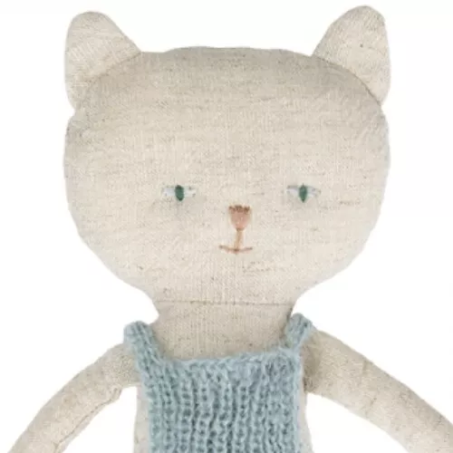 De poezenknuffel heeft een geborduurde snoet en draagt een gebreide tuinbroek die met enige moeite uitgetrokken kan worden.