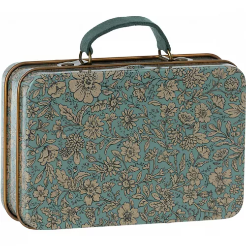 Met een vintage, blauwkleurig bloemenprintje is dit kleine metalen koffertje ‘Suitcase, Metal – Blossom Blue’ geschikt om spulletjes van de Maileg muizenfamilie in op te bergen.