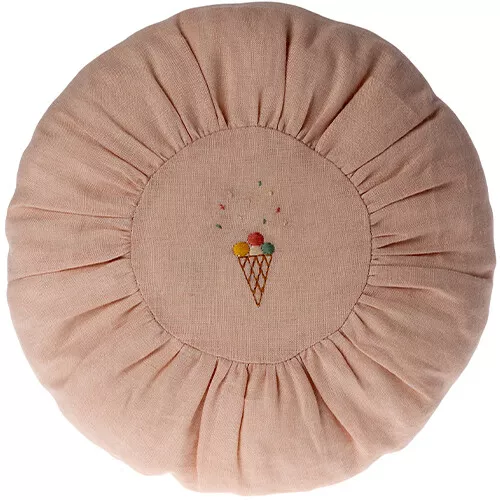 Een decoratief kussentje van het Deense merk Maileg voor een speels accent op de bank of op bed. Het ronde kinderkussentje is in het midden versierd een geborduurd ijsje.