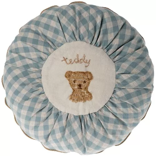 Een decoratief, geruit kussentje ‘Cushion, Round Small – Teddy Checked’ van het Deense merk Maileg voor een speels accent op de bank of op bed. Het ronde kinderkussentje is in het midden versierd met het geborduurde snoetje van een teddybeer.