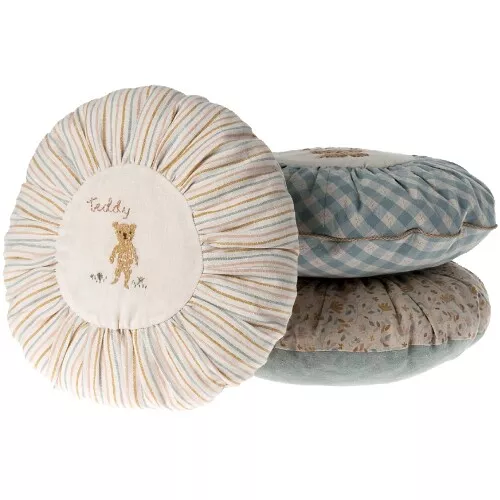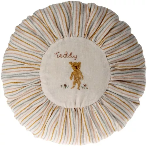 Een decoratief, rond kussentje ‘Cushion, Round Small – Teddy Striped’ van het Deense merk Maileg voor een speels accent op de bank of op bed. Het ronde kinderkussentje is in het midden versierd met een geborduurde teddybeer.