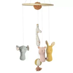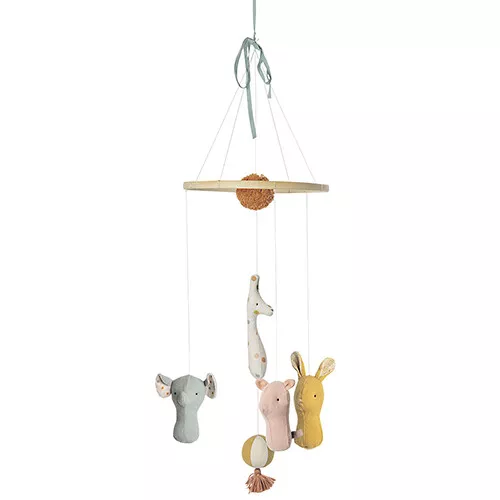 Aan de mobiel bungelen de kenmerkende Maileg vienden in zachte kleuren: een konijn, een olifant, een varken en een giraf. In het midden van de mobiel hangt een pompom en tussen de dieren een balletje met kwastje.