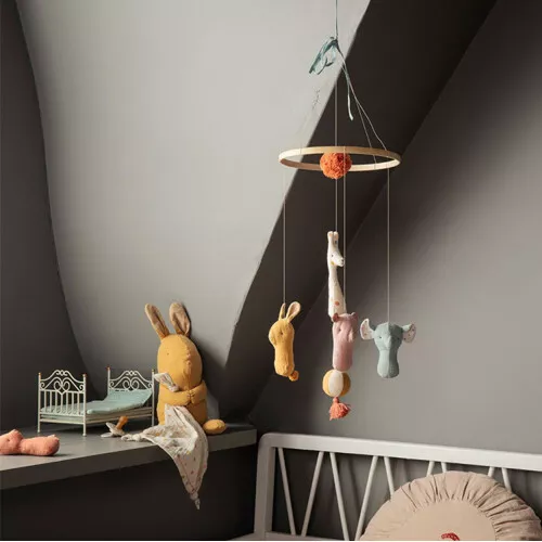 Een sfeervolle kindermobiel ‘Lullaby Friends’ van het Deense merk Maileg om heerlijk onder weg te dromen.
