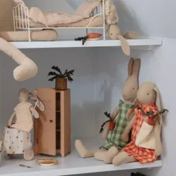 Een goed gevulde boodschappentas met wortels ‘Carrots in Shopping Bag’ voor poppenhuisbewoners. Met de boodschappentas van het Deense merk Maileg hebben knuffels en poppen een heerlijk gezonde snack in huis.