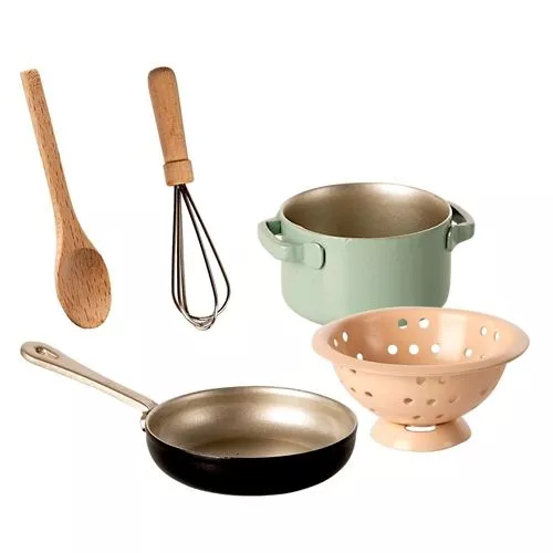 Een kartonnen, retro poppenhuisfornuis met kookgerei van metaal en emaille ‘Cooking set’ van het Deense merk Maileg voor de keukenprinsen en -prinsessen knuffels.