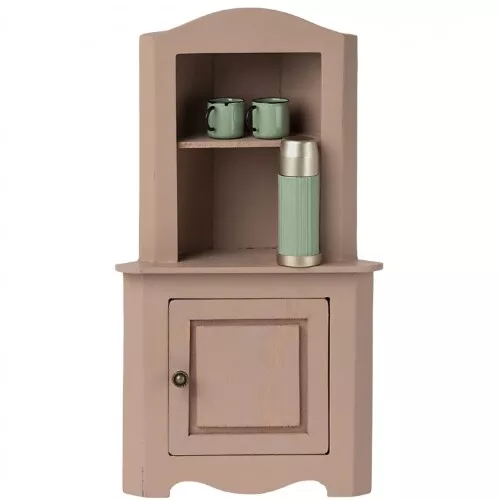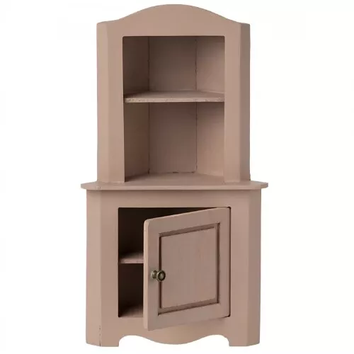 Ook knuffeltjes hebben spulletjes om op te ruimen. In deze houten speelgoedkast ‘Miniature Corner Cabinet – Rose’ uit de Mini collectie van het Deense merk Maileg kan dat in stijl.