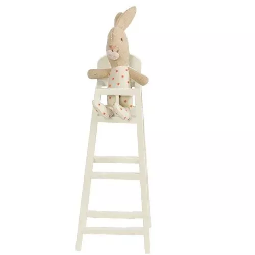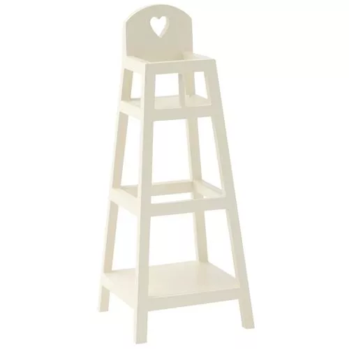 Een kleine, witte, houten poppenstoel ‘High Chair My – White’ in landelijke stijl van het Deense merk Maileg. Onmisbaar speelgoeg in de babykamer en een prachtige toevoeging aan het poppenhuis.