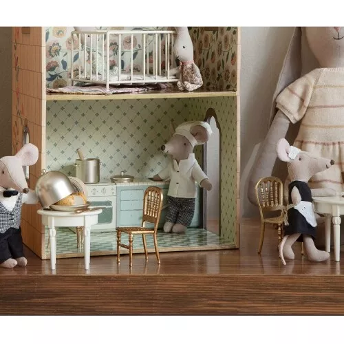 Een luxe poppenhuisstoeltje ‘Chair, Mouse – Gold’ van het Deense merk Maileg. Het speelgoedstoeltje is geschikt voor de muizenknuffels van Maileg.