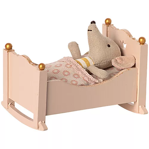 Een houten poppenhuiswiegje met fleurig beddengoed ‘Cradle Baby Mouse’ van het Deense merk Maileg om babymuisjes prinsheerlijk toe te dekken. Het knuffeltje kan zoetjes in slaap gewiegd worden, dankzij de ronde onderkant van het wiegje.