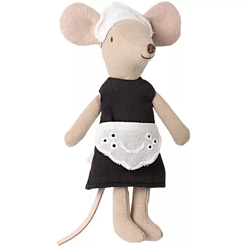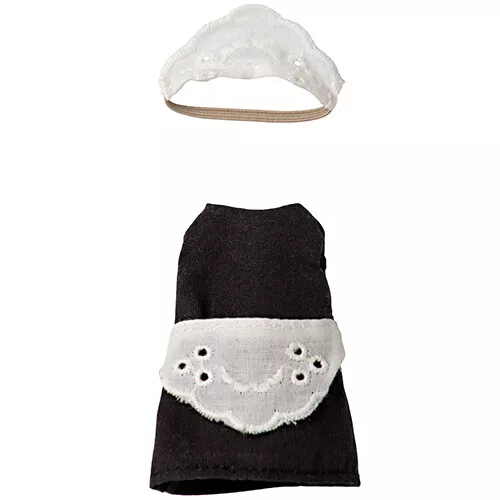 Een zwarte uniform met wit schort en mutsje van het Deense merk Maileg voor de grote zus knuffelmuis die klaar staat om te helpen met schoonmaken, om de gasten te bedienen of te helpen in de keuken!