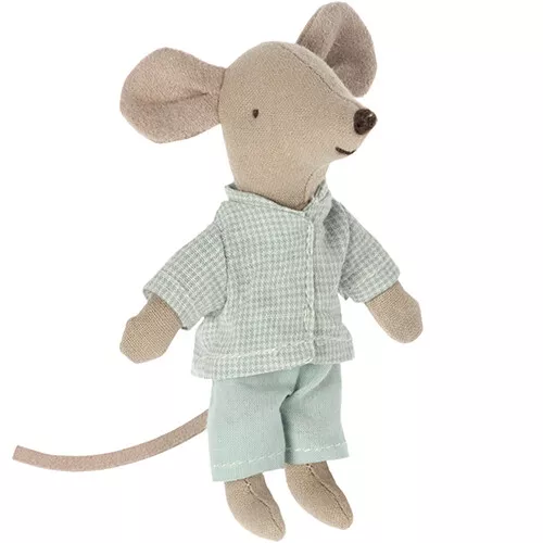 Een poppenpyjama van het Deense merk Maileg voor de kleine broer knuffelmuis, maar ook kleine zus trekt graag de pyjama van haar muizenbroertje aan.