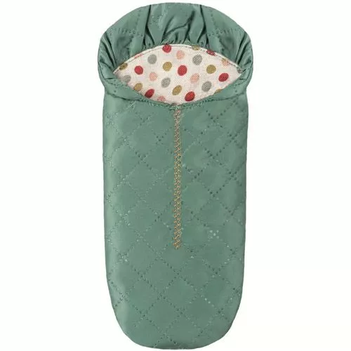 Het knuffelmuisje kan ook mee op vakantie. Het kan ’s avonds lekker slapen in de groene polyester slaapzak van het Deense merk Maileg.