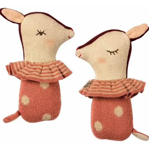 Deze ‘Bambi Rattle – Rose’ van het Deense merk Maileg is een vrolijke rammelaar en zachte hertenknuffel. De knuffel beschikt over een slapende en wakende zijde en heeft twee oren en een staart waar aan gefriemeld kan worden.